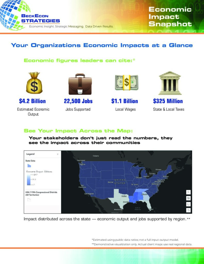 Custom Model (Add-On) – Enhanced with your internal data for more precise estimates, tailored projections, and expanded visuals. Interactive maps can also be added here to show impact by geography (state, county, or congressional district).