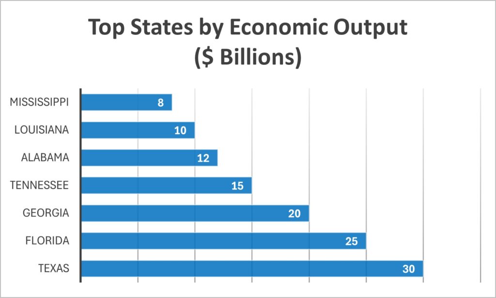 Sample visualization: Top States by economic output. Client deliverables are tailored to highlight the regions and sectors most relevant to your stakeholders.