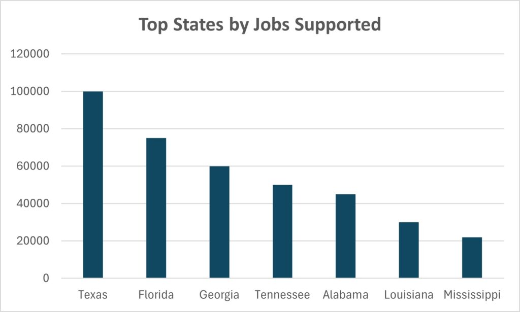Sample visualization: Top States by jobs supported. Client deliverables are tailored to highlight the regions and sectors most relevant to your stakeholders.